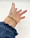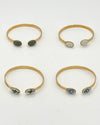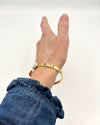 Esalta il tuo stile con questo raffinato bracciale rigido dalla linea ovale, studiata per seguire con grazia l'anatomia del polso. Realizzato in ottone dorato dalla finitura calda e luminosa, il gioiello è impreziosito da delicati inserti in porcellana lavorata a mano.