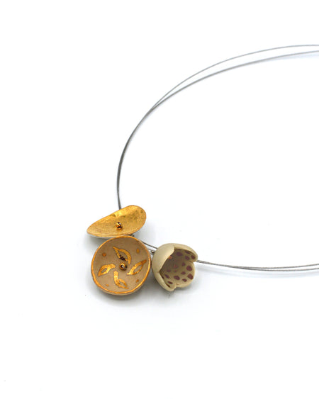 Le collane sono realizzate con elementi in porcellana modellati in forme diverse. Vengono montate in modi differenti, a mano e con cura, osservando come gli elementi possono funzionare al meglio e risultare massimamente valorizzati. Si dividono in due grandi famiglie: le collane corte e le collane lunghe.
