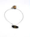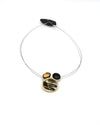 Il look di questa collana a cavetto è grintosissimo: pennellate decise in smalto nero lucido, affiancate a quelle in lustro oro, danno una grande energia all'elemento centrale. Accanto a lui due elementi piccoli e concavi, molto simili ma trattati in modo opposto: luce vs. ombra, oro vs. nero.