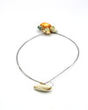 Il doppio cavetto metallico è rivestito da un microfilm in plastica, per proteggere la pelle dal contatto col metallo e non sporcare gli indumenti. Presenta una chiusura a cappio con elemento in porcellana bianca.