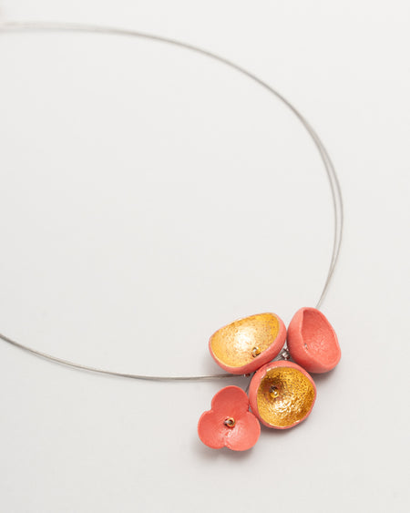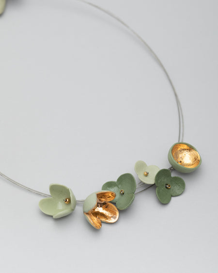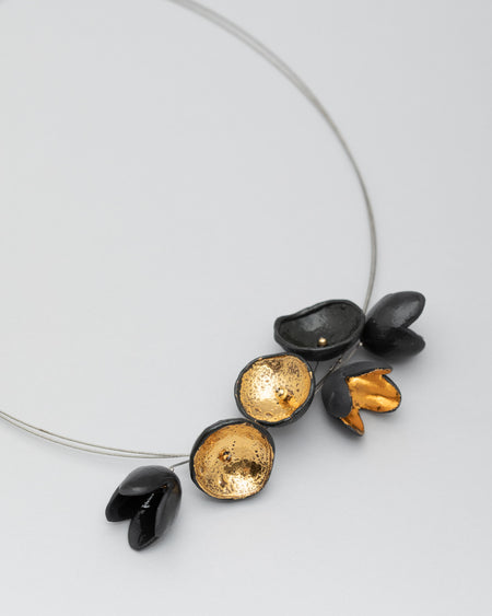 Le collane sono realizzate con elementi in porcellana modellati in forme diverse. Sono proposti modelli in argento e in acciaio, completati da finiture preziose come oro e platino. Vengono montate in modi differenti, a mano, con cura, osservando come gli elementi possono funzionare al meglio e risultare massimamente valorizzati.